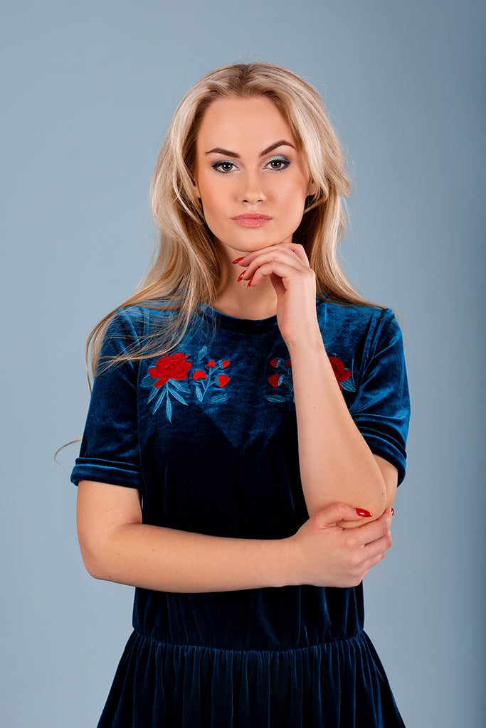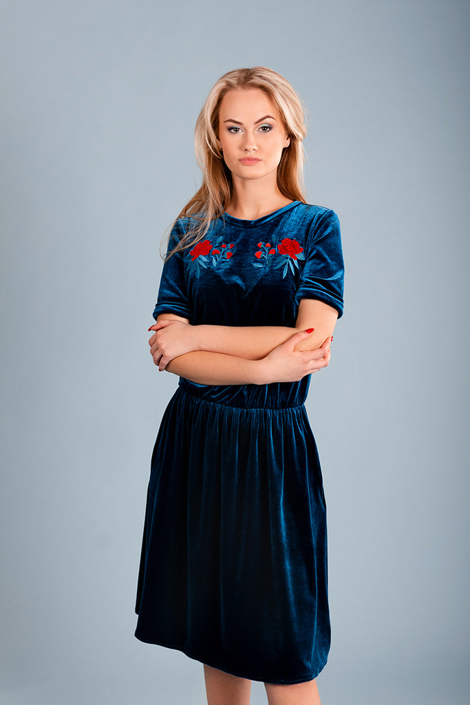 The custom embroidery is made by our wonderful designer at Colorfall. The crushed velvet look will give the dress a very classy vibe, but its cut will make you feel very comfortable. The Dress has 2 side pockets sewn within the seems of the dress.