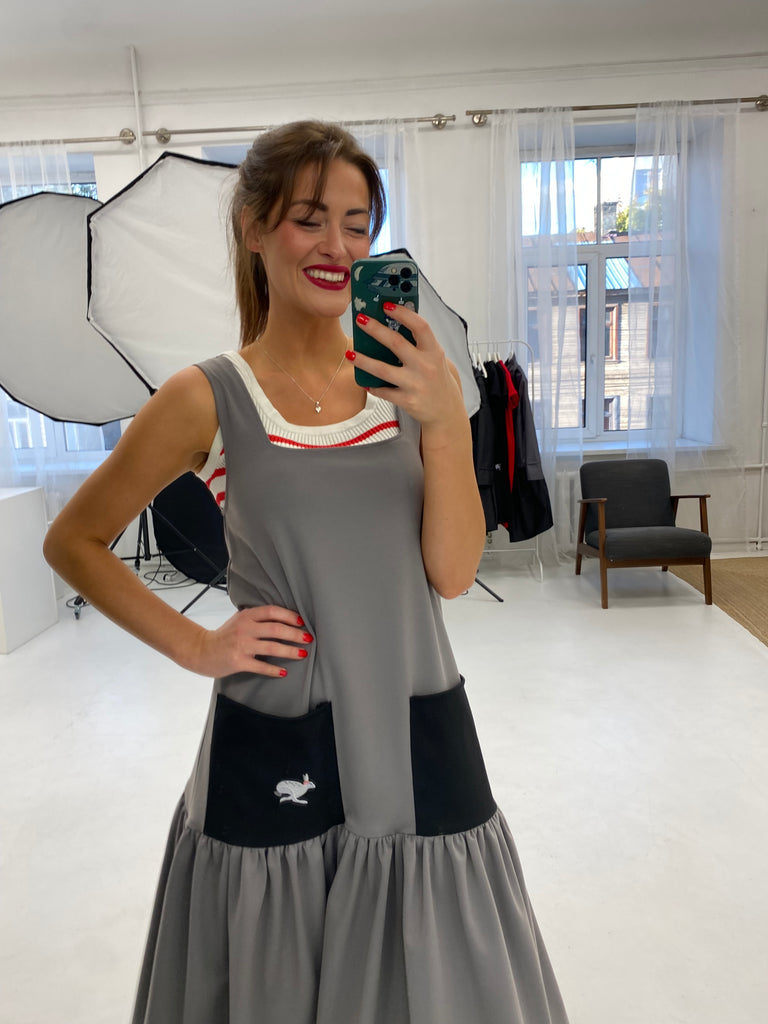 Beige dress with red peony embroidery on the pockets