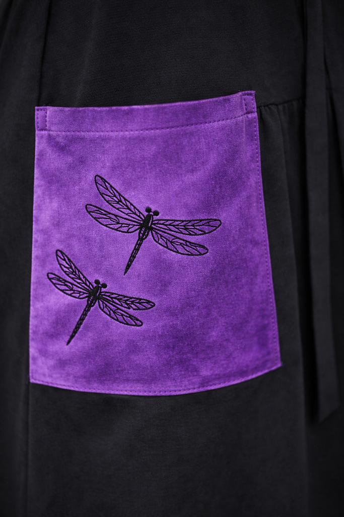 The highlight of the dress is the velvet pockets with dragonfly embroidery, adding a unique and artistic detail.
