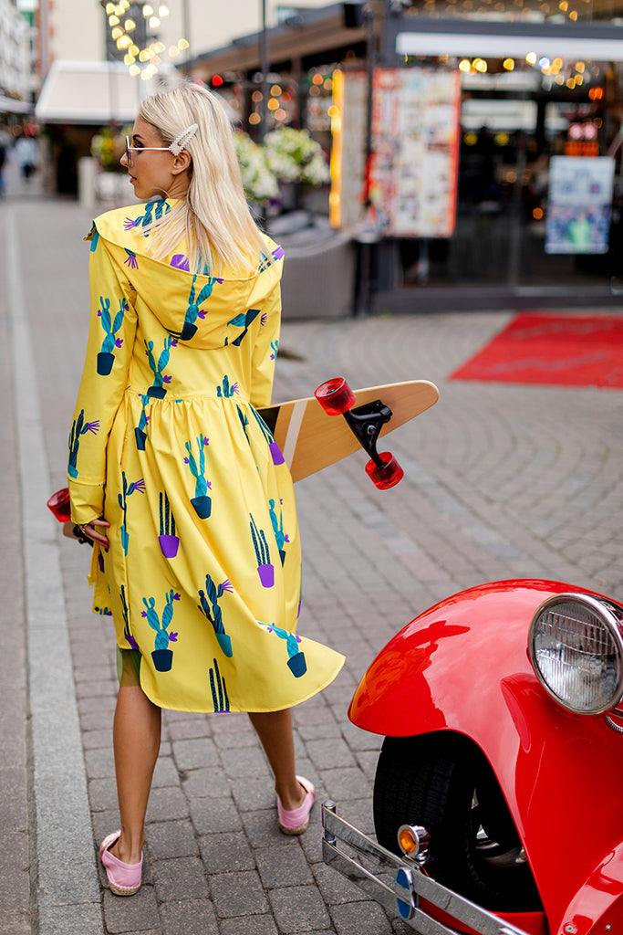 The unique raincoat patters are created by our designer at Colorfall Clothing. The fabrics are custom printed in Latvia and are handmade in our warehouse. The Main fabric is water and wind proof, lining is made out of 100% viscose, which will make you feel extra comfortable during the rainy and windy weather. Seams have been re-enforced to guarantee the waterproof quality.