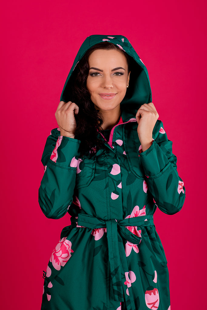 Dark Green raincoat with Peonies print / Long skirt