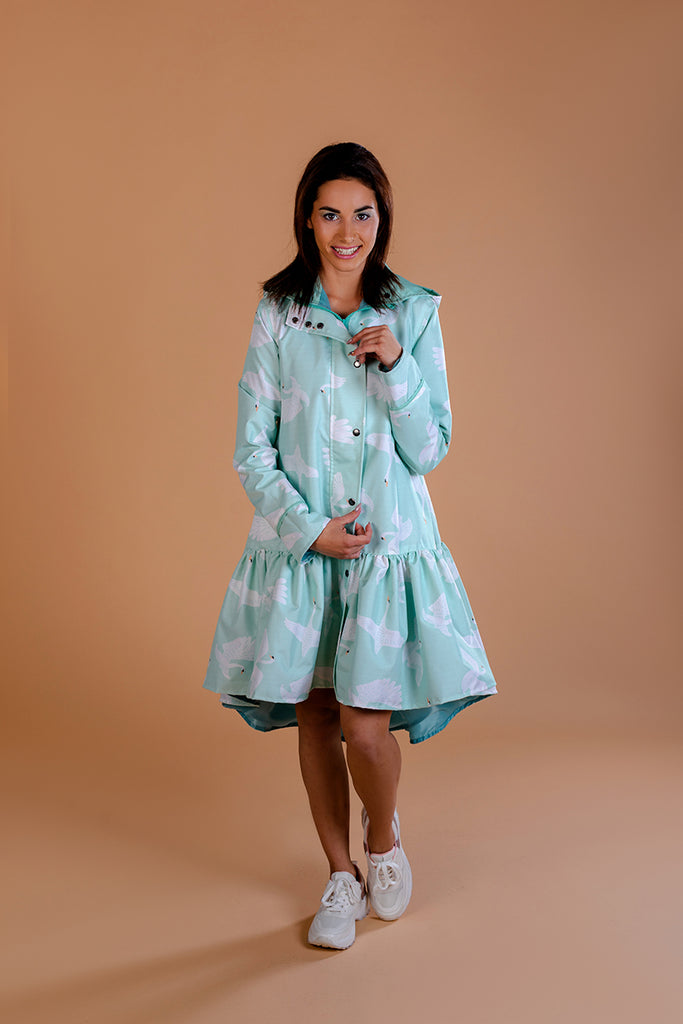 Mint Green raincoat with Swans print / Trapeze