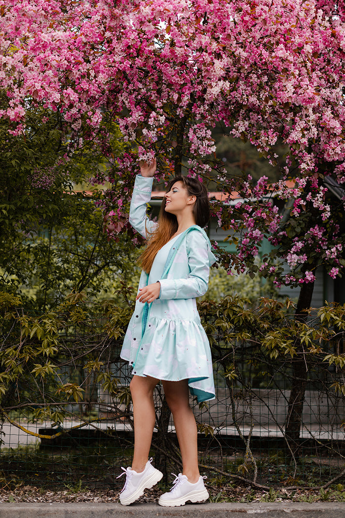 The unique raincoat patters are created by our designer at Colorfall Clothing. The fabrics are custom printed in Latvia and are handmade in our warehouse. The Main fabric is water and wind proof, lining is made out of 100% viscose, which will make you feel extra comfortable during the rainy and windy weather. Seams have been re-enforced to guarantee the waterproof quality.